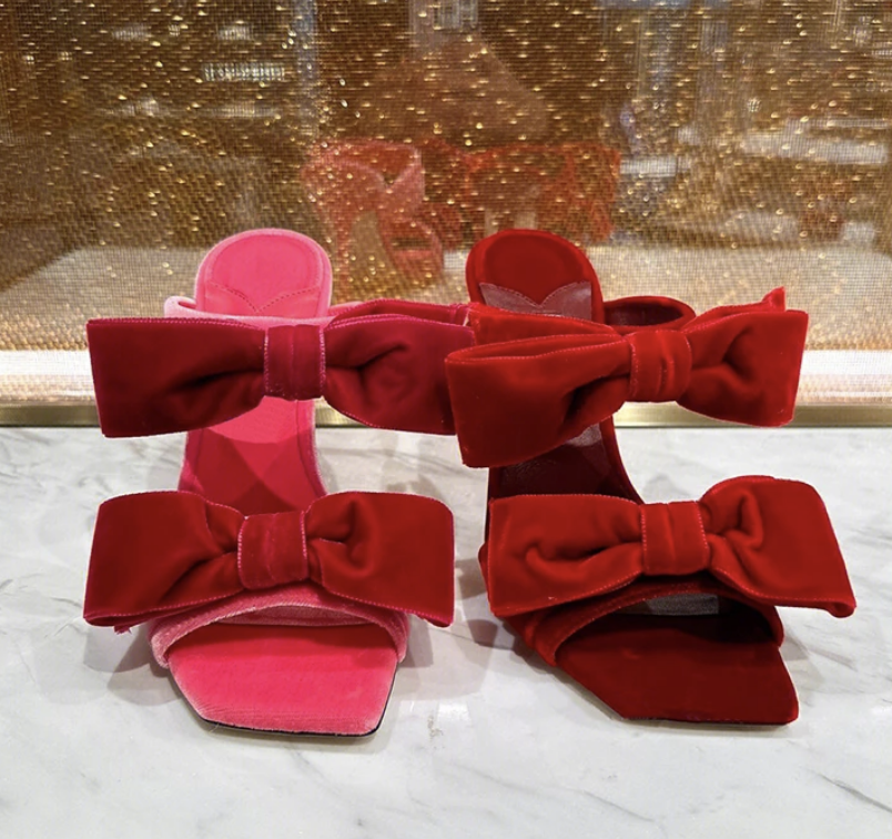 cute v day velvet bow sandals in either red and pink or red velvet. 4 inch heel and square toe