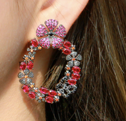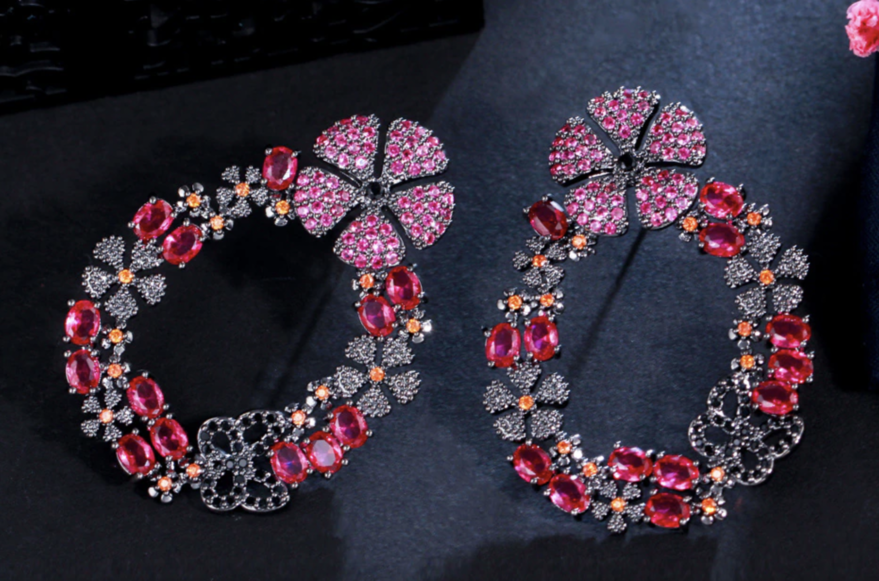 Beautiful Hot Pink Red Cubic Zircon Crystal Long Drop Flower Party Earrings