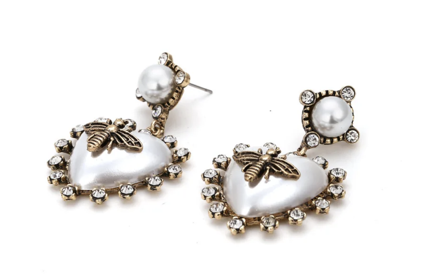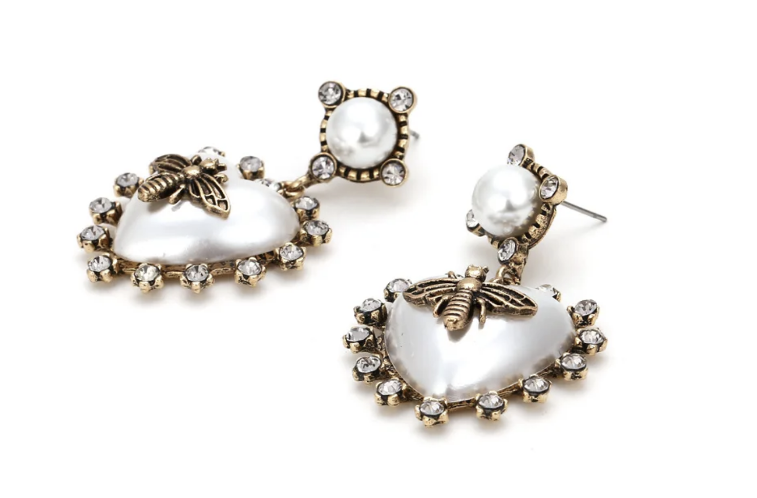 Valentines Day Heart Bee Earrings White and Vintage gold look