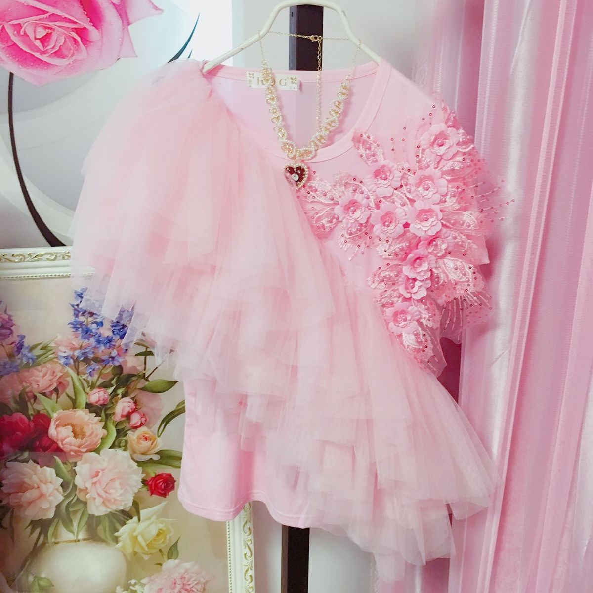 Sweet Beads Diamond Lace-Collared T-shirt