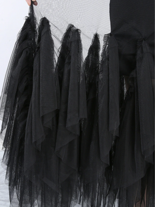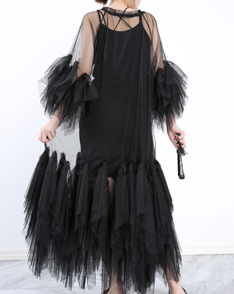Black Ruffles Long Big Size Dress New Round Neck Three-quarter Sleeve Loose robe