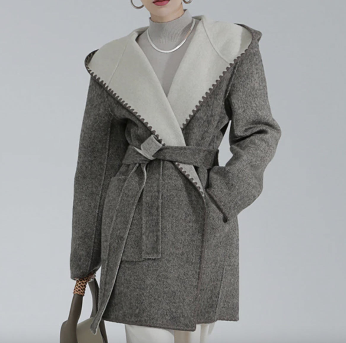 Woolen Coat Hooded Buttonless Lace-up Straight Two-sided Gradient Mid-calf OvercoaT