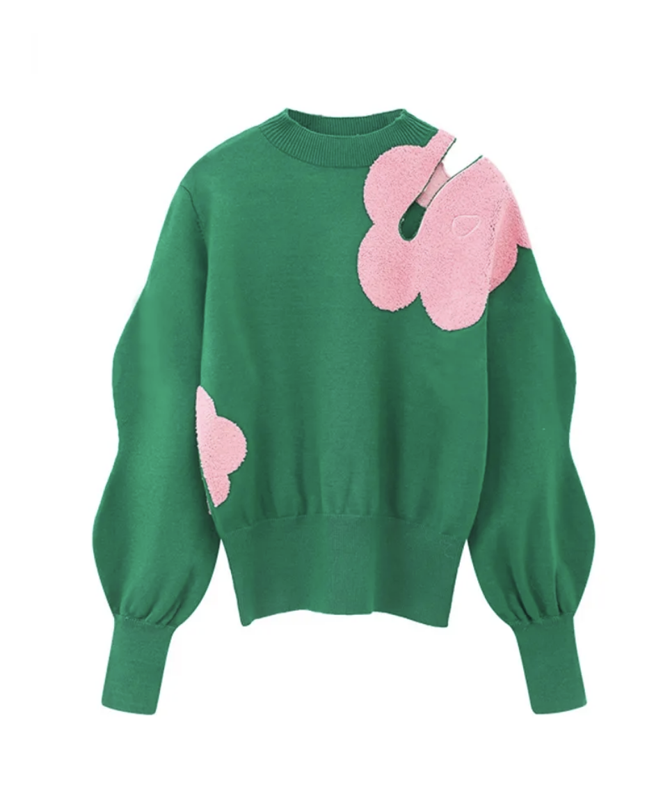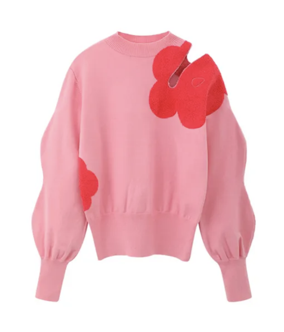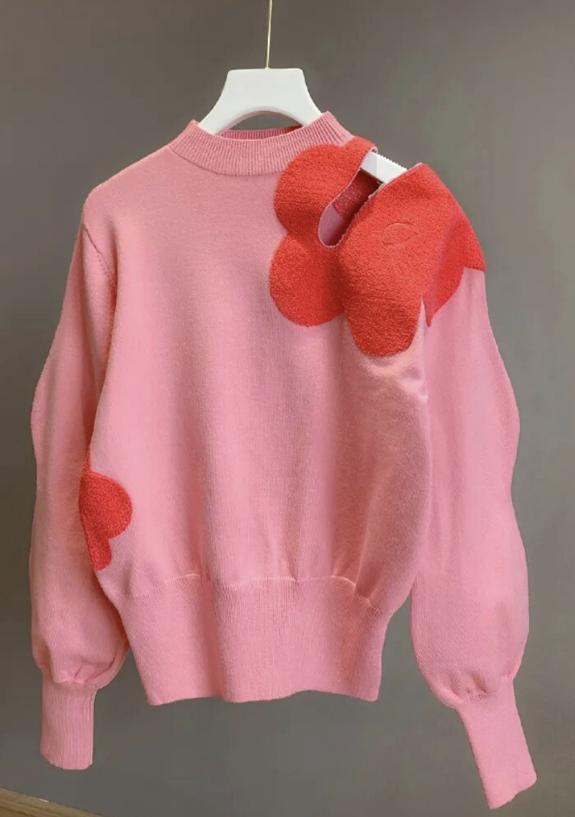 Autumn Spring Pink Flower Hollow Out Knit Pullover