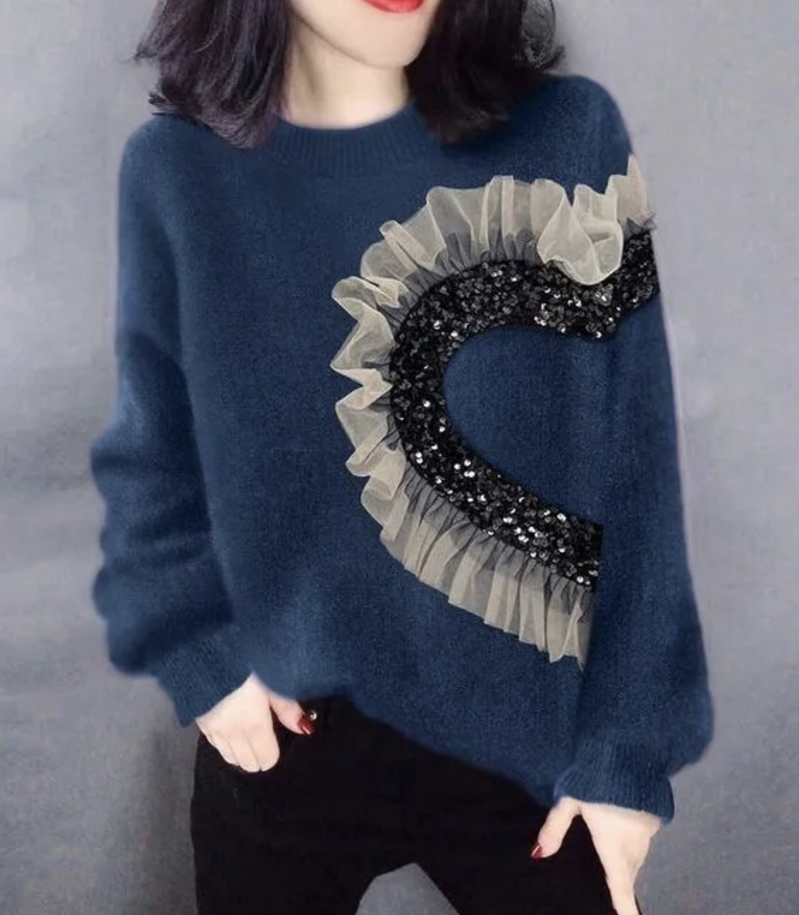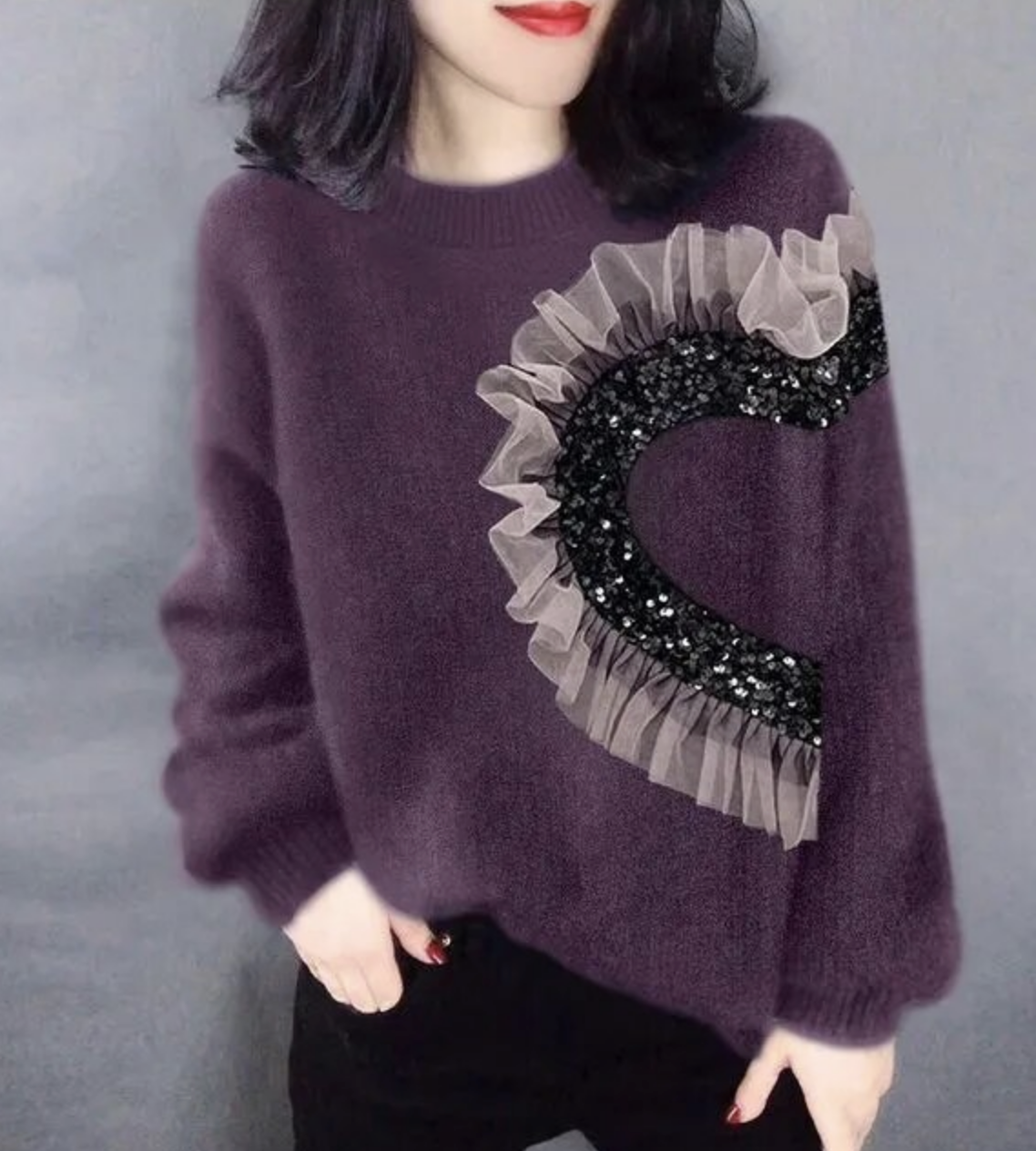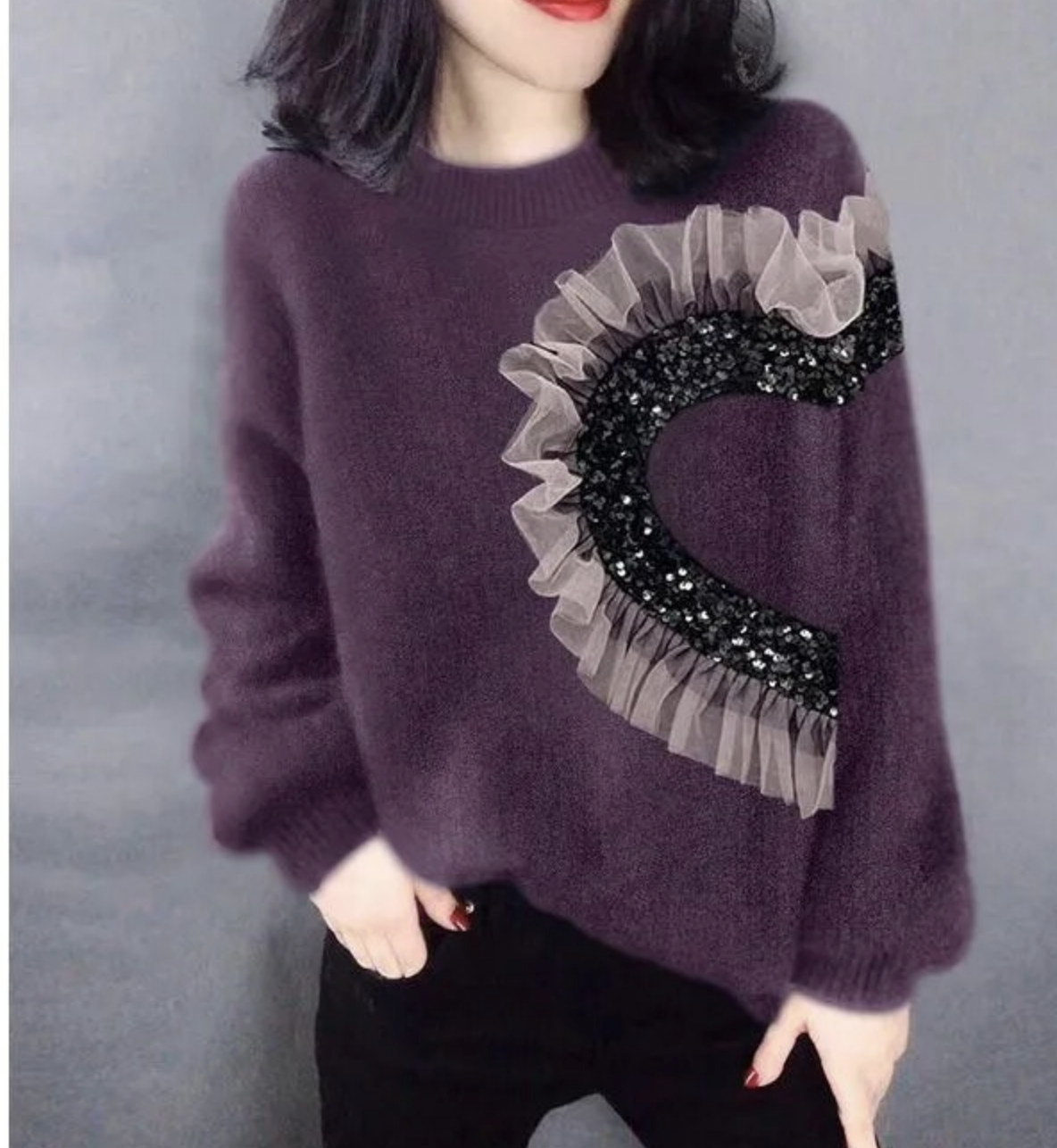 Vintage Ruffle Mesh Sequins Streetwer Knitted Sweater