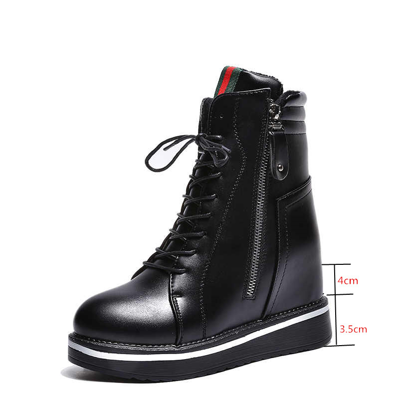 Thick wedge bottom bootie with zipper fashion detail, lace up front. and " designer" red and green stripe detail.