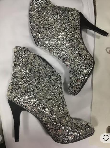 Black base color boots with multi sizes of clear crystals and rhinestones. 4' black heel.Make your grand entrance with a pair of these on your tootsies! Please allow up to 4 weeks to receive this item. It is hand made as ordered. If you need faster shipping , please contact us for a shipping quote.