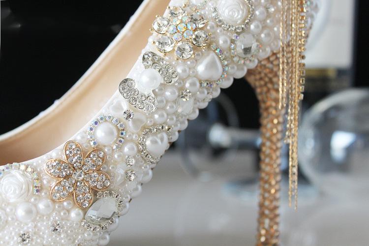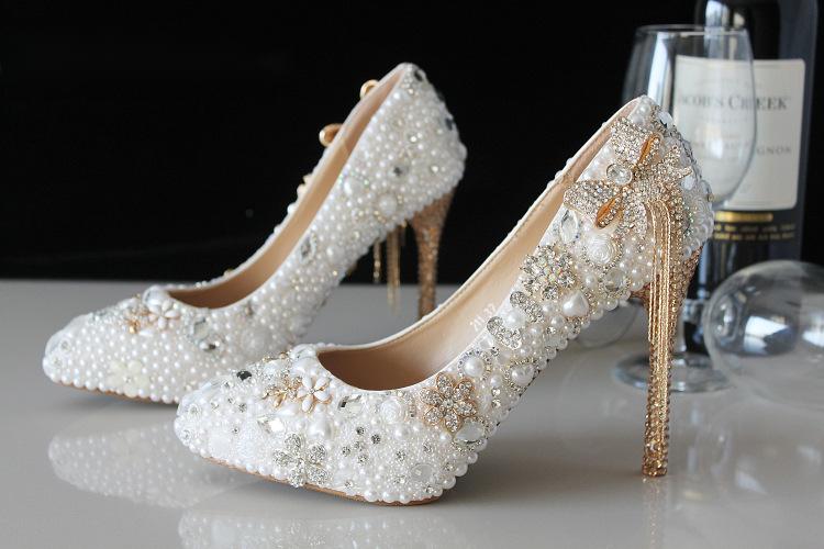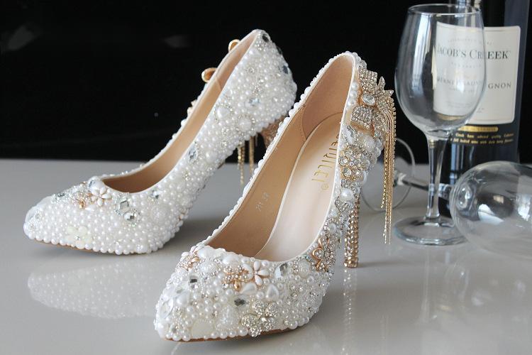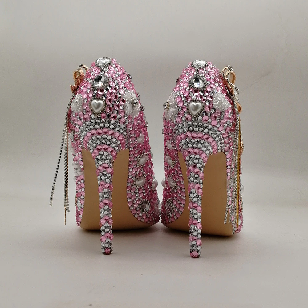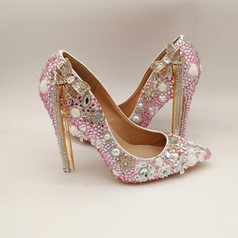 2022 Pink Crystal Bridal Wedding Shoes White Peal Women Party Dress Shoes Pointed Toe Pumps High Thin Heel Luxury Rhinestones