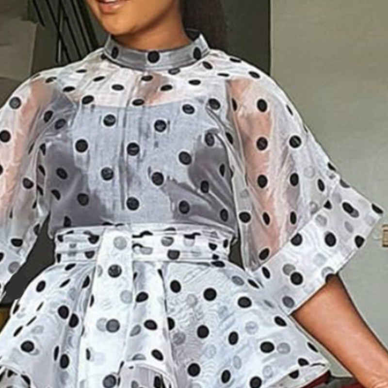 Women White Blouses Polka Dot Peplum See Through Sexy Thin Transparent Half Flare Sleeves Waist Belt Tops Shirt Fashion