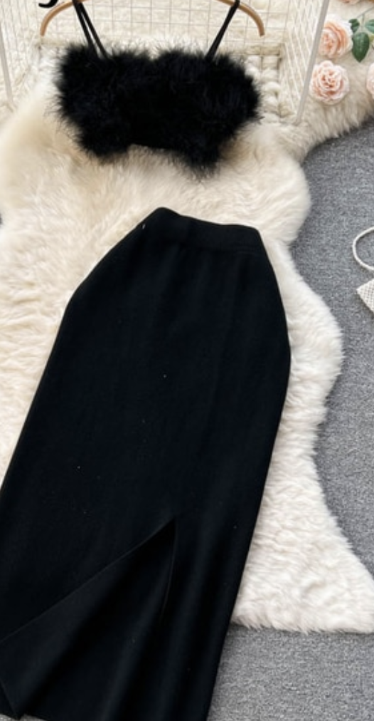 Pink Women Knit Two Piece Sets Camis Sexy Short Top+ Elastic Waist Knit Split Long SKirt Fashion Solid Women Suits