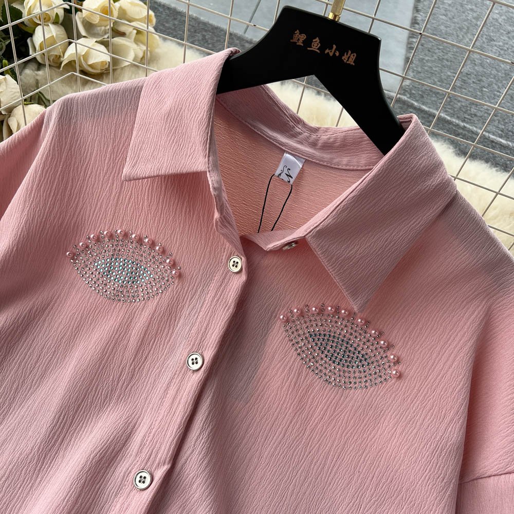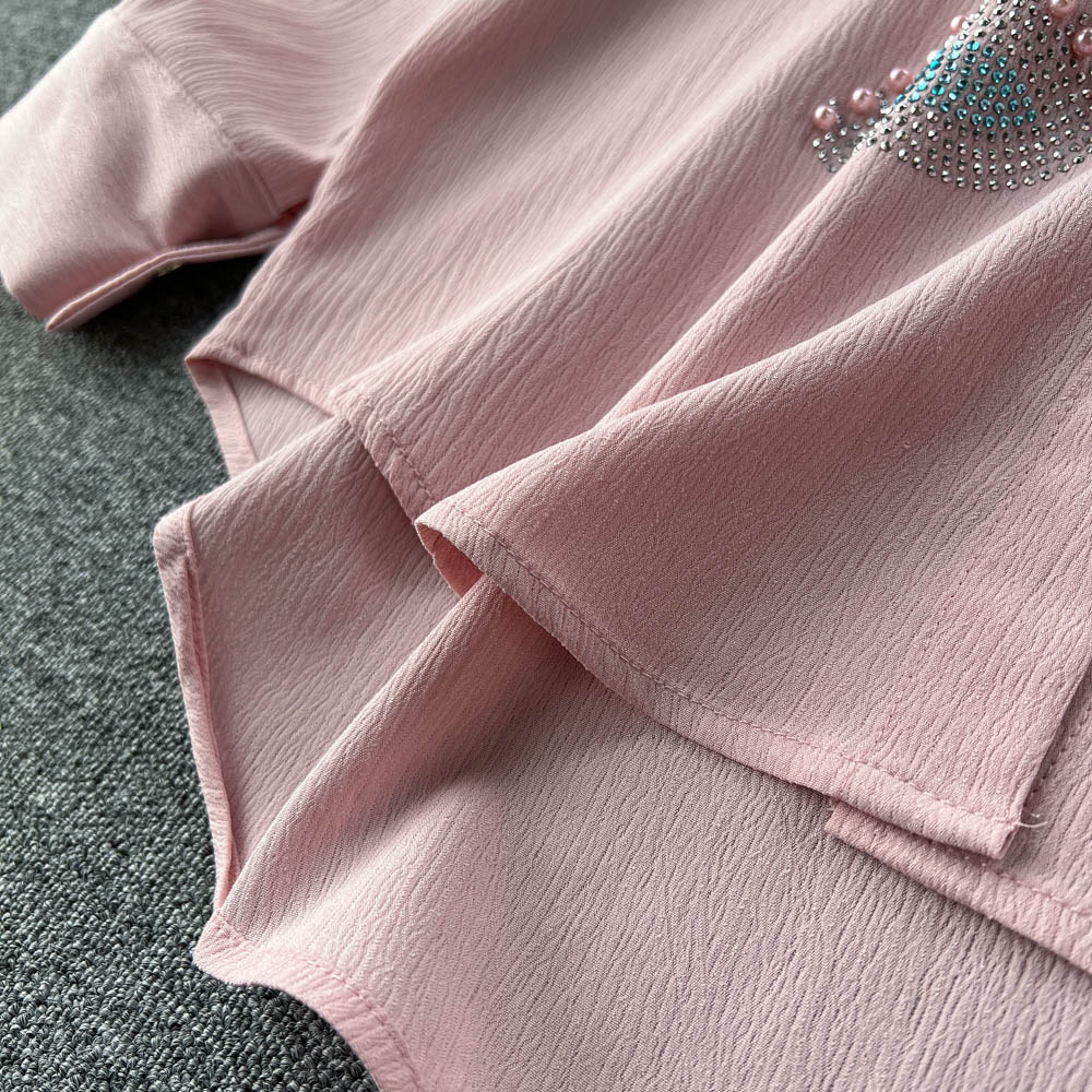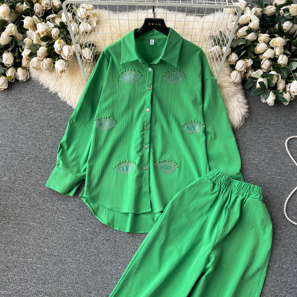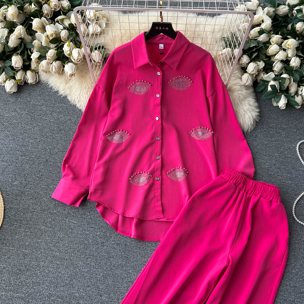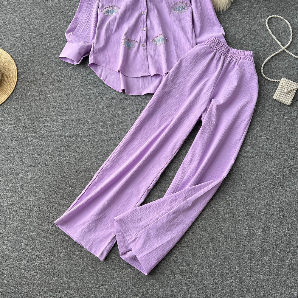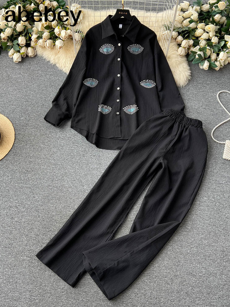 Beading Street Women's Set Long Sleeve Shirt Tops and Wide Leg Pants Elegant Tracksuit Two Piece Set