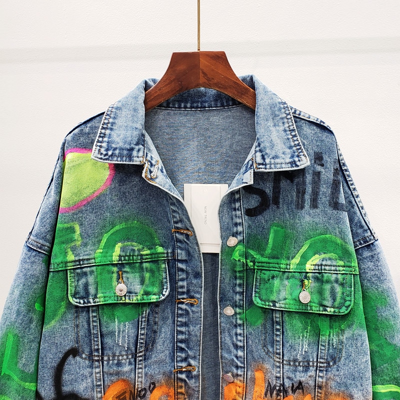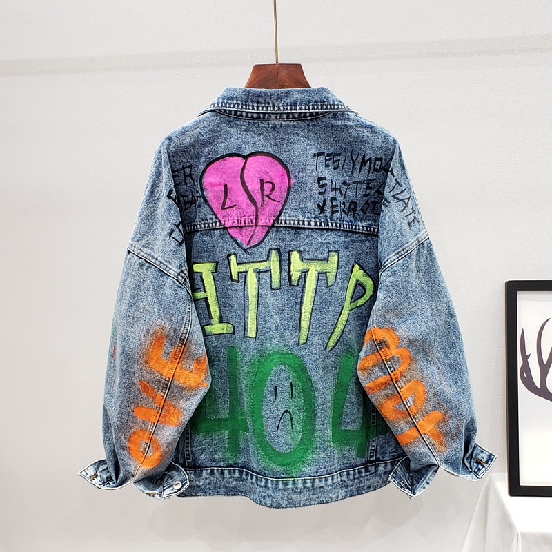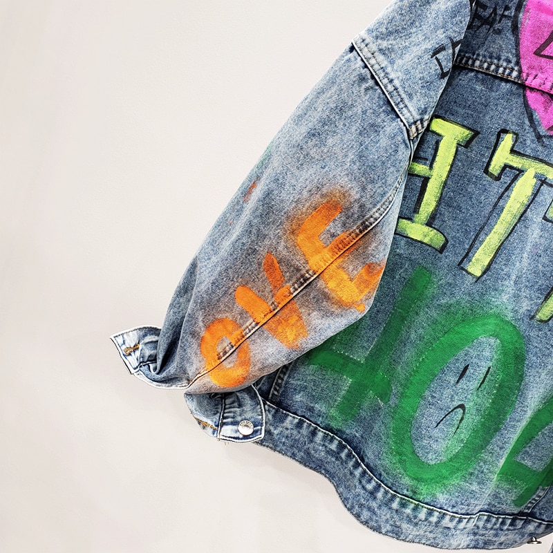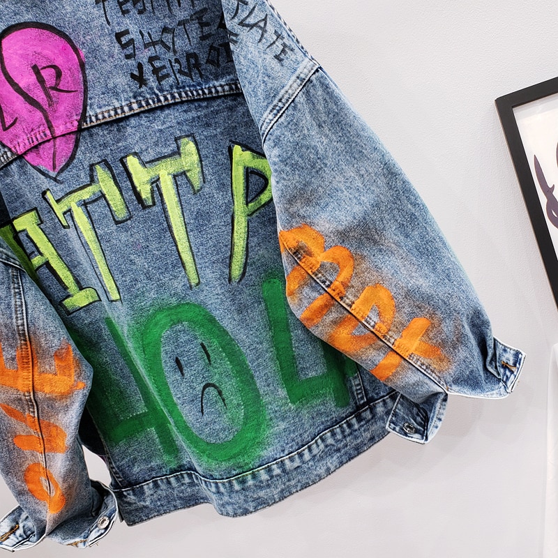 Casual Letter Painted Print Frayed Harajuku Washed Denim coat
