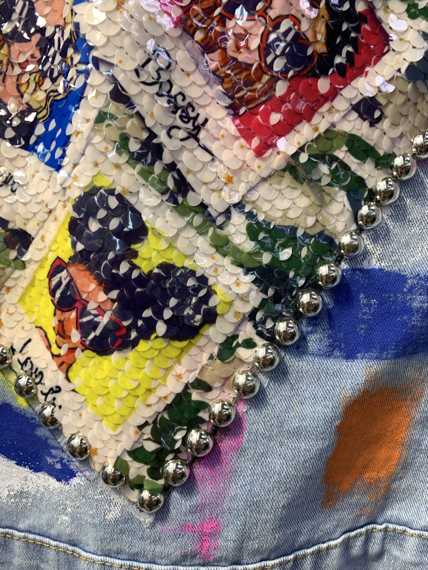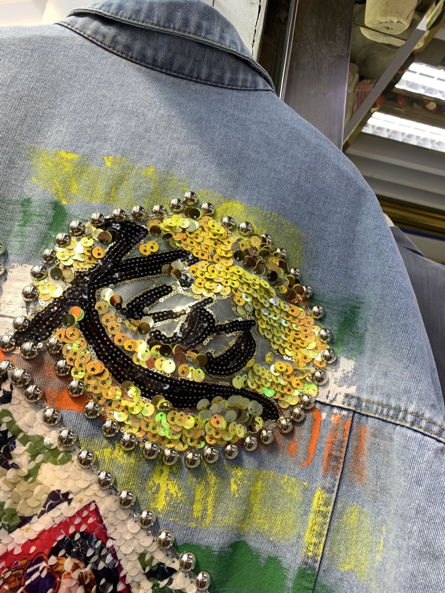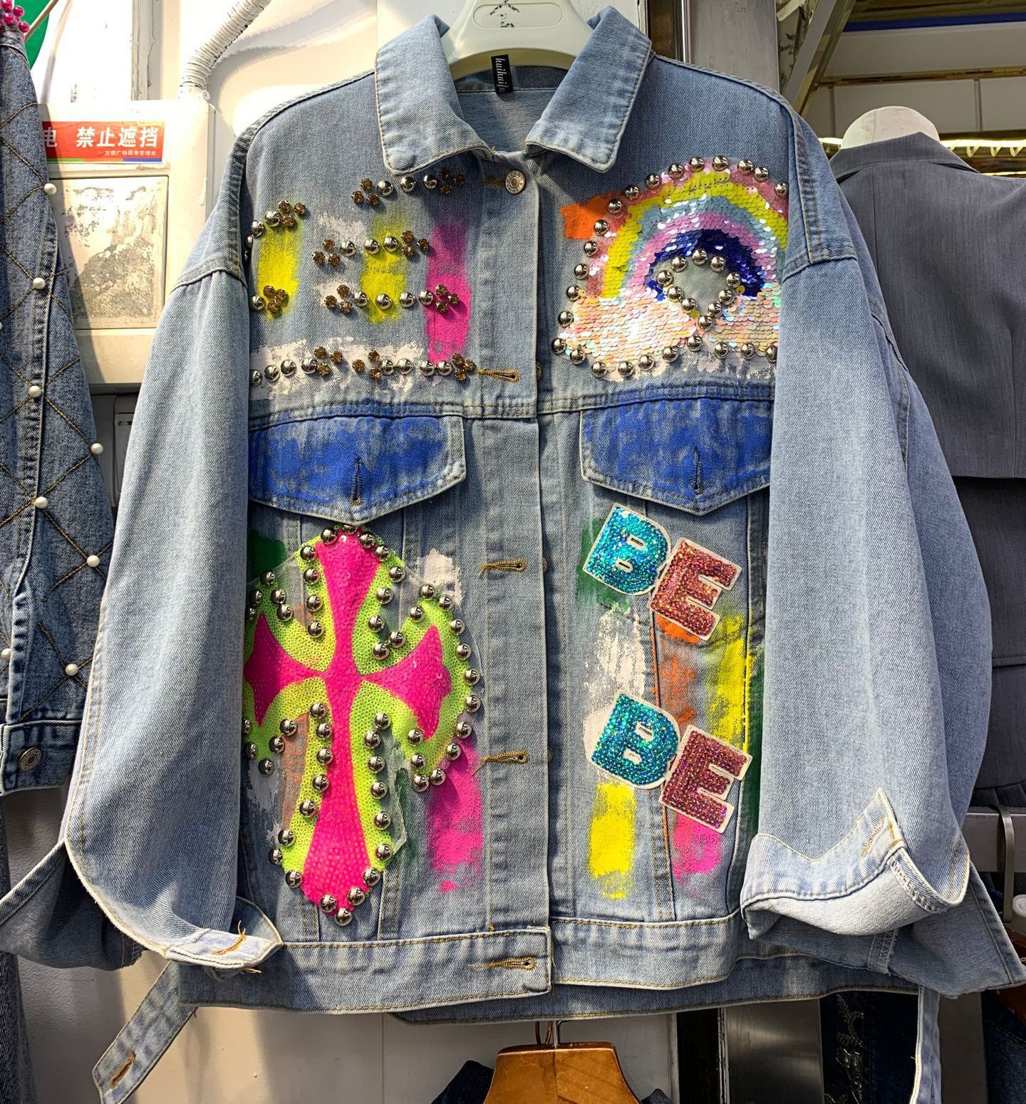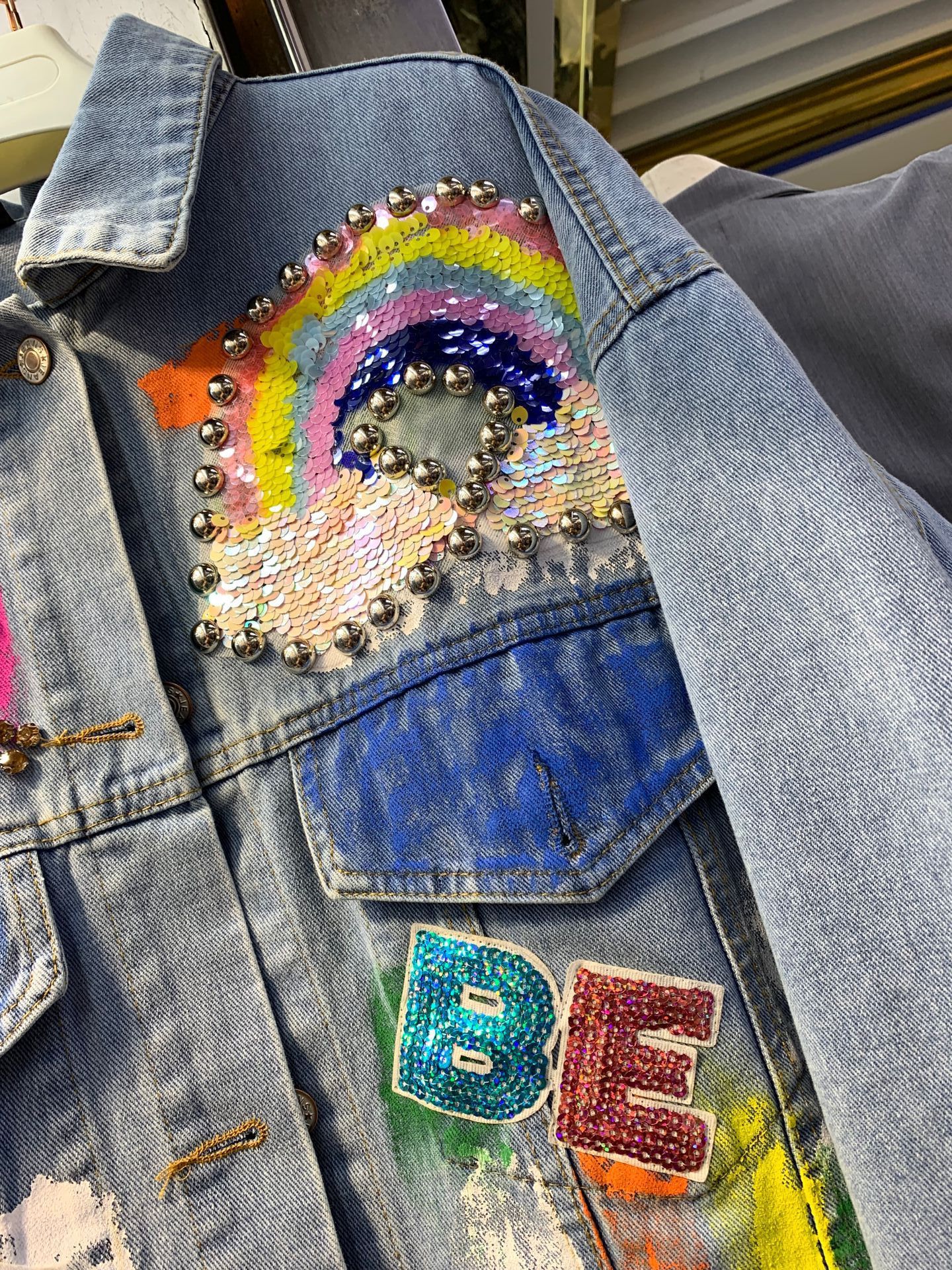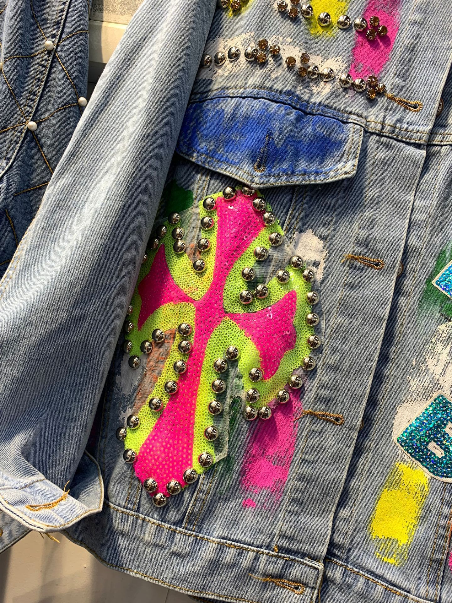 Hand-Painted Graffiti Beaded Lapel Long-Sleeved Denim Jacket ONE SIZE