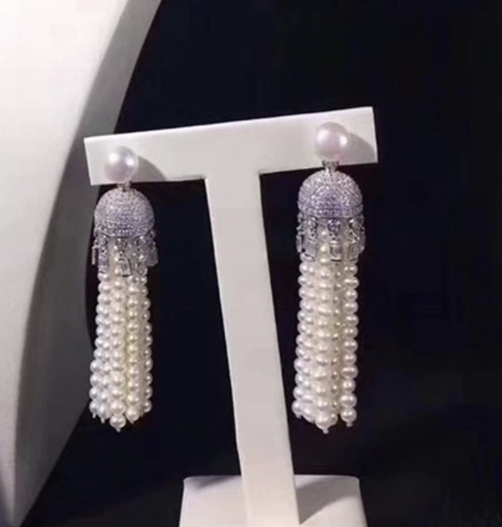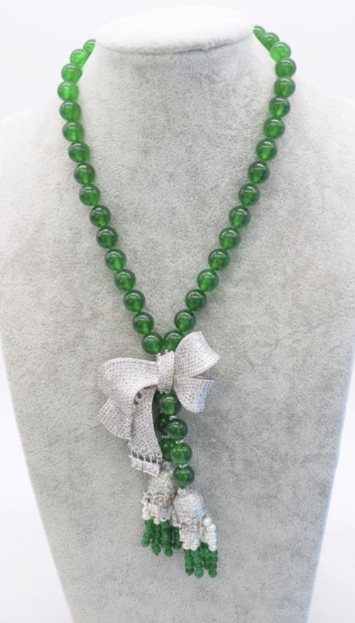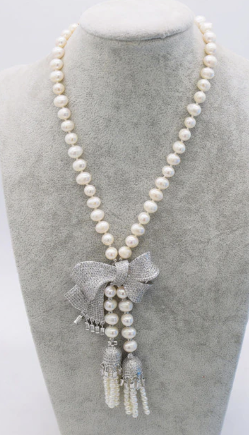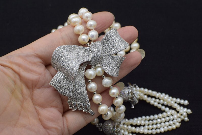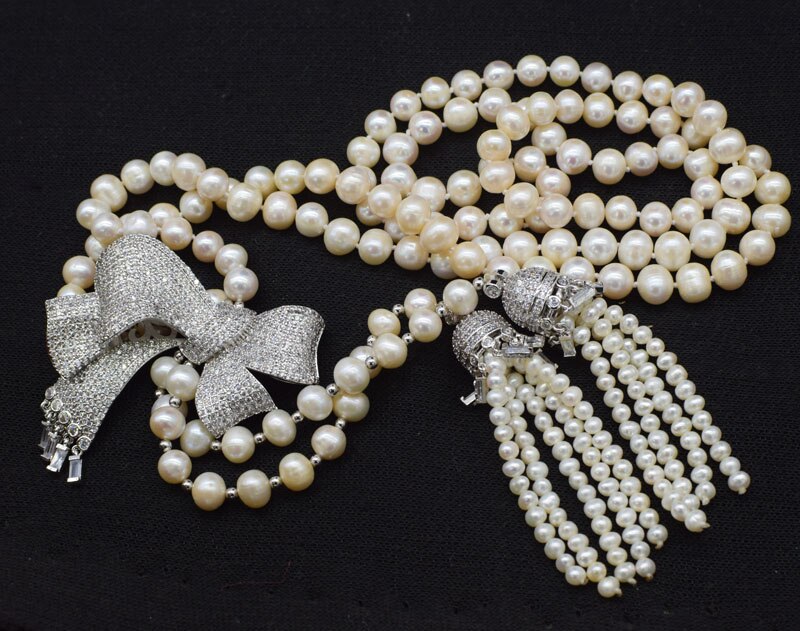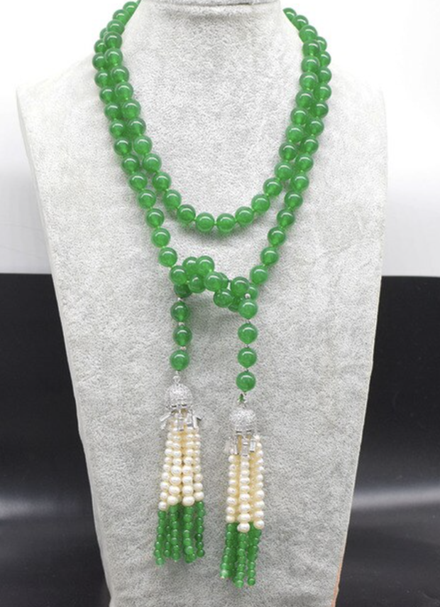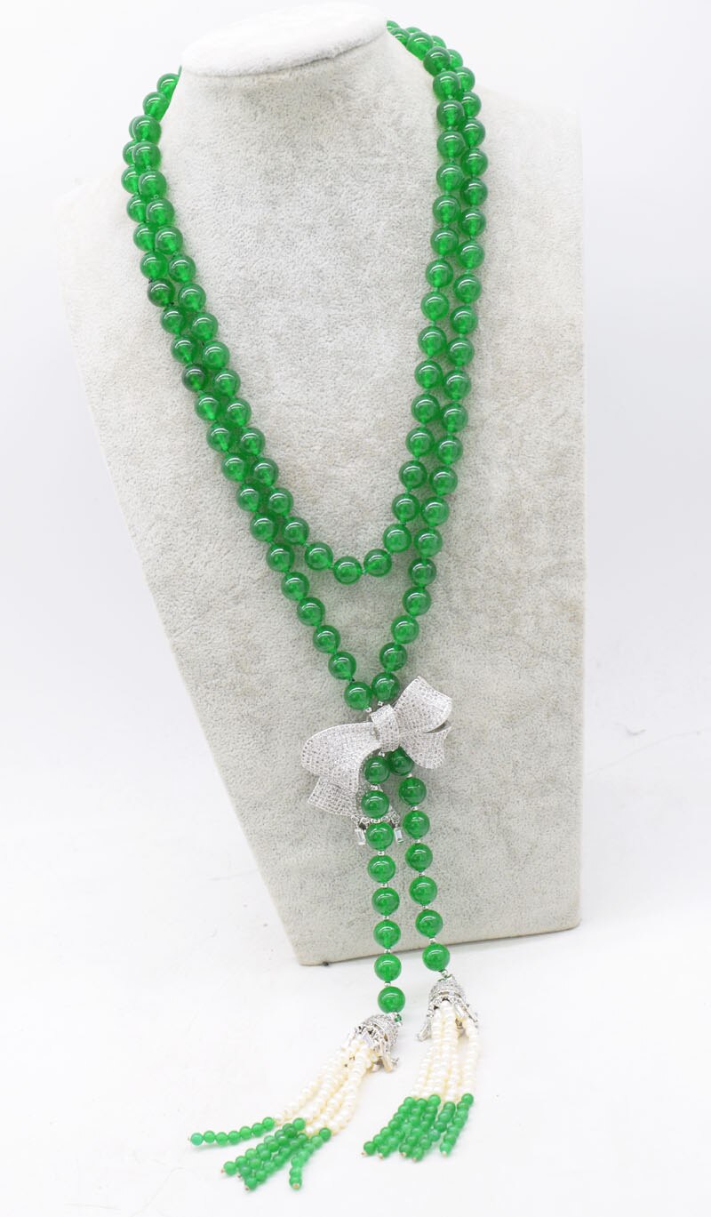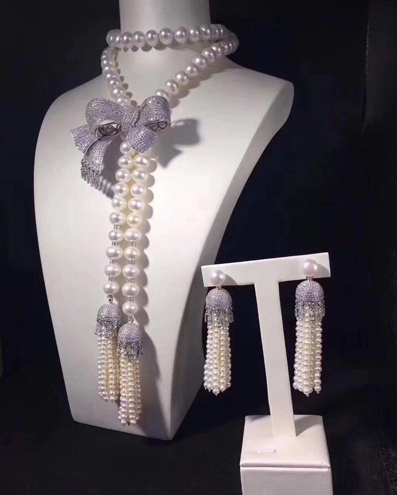 freshwater pearl/green jade 8-9mm white near round &bowknot tassel neklace /earrings 45inch